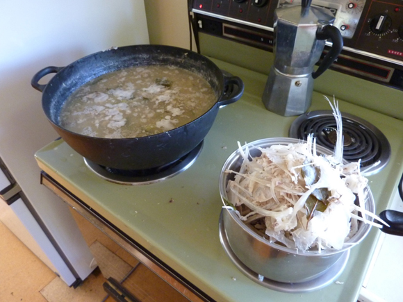 You are then left with a head and a spinal column and all the ‘fins.’ Break up the spine into chunks that will fit into your Le Creuset pot. Fins, the flanks adjacent to the abdominal cavity and all remaining bones are used. The only waste in catching a fish this big should be the bones after reduction. Combine shittake/kombu and sea salt into the pot to make your dashi kombu. Soak for ten to twenty then add some bay leaves and simmer for 1.5hrs stirring continually. Remove the big bones and scrape them clean into the pot prior to removal. Attend your pot carefully you don’t want it to boil. Simmer gently. Stir gently and continue to remove the bones as they come clean. I like to break up the spine bones individually to ensure their goodness is released into the broth. Strain off the liquid when you feel its complete (obviously your tasting and seasoning with Sea Salt all the way along) You can gather up to a pound of meat from the head. The cheeks are the sweetest part so make sure you keep those in there! (I like to pick those off as ‘cooks tax’ early in the simmering process) Add white miso and bring back up to heat. Cut some small chunks of fillet off and season with salt. Brown in olive oil (or butter if you come from NZ) add them into the broth to cook through. Serve up in small bowls with freshly cut spring onions and a few ‘chunks’ of the sweet fillets.